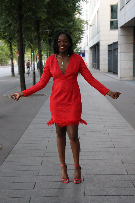 Robe moulante en dentelle et ourlet à franges
