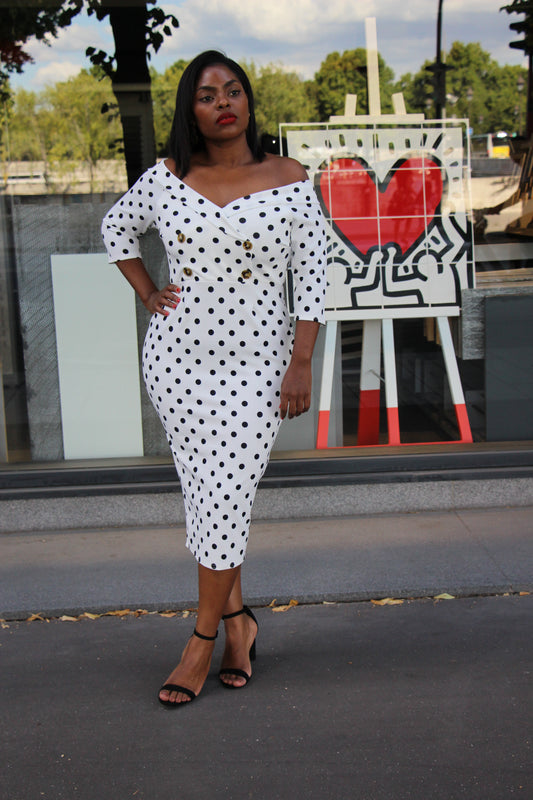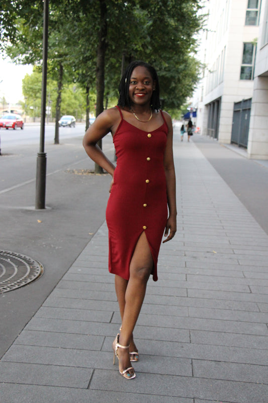 Robe mi-longue en tissu néoprène avec volants,boutons et ourlet péplum